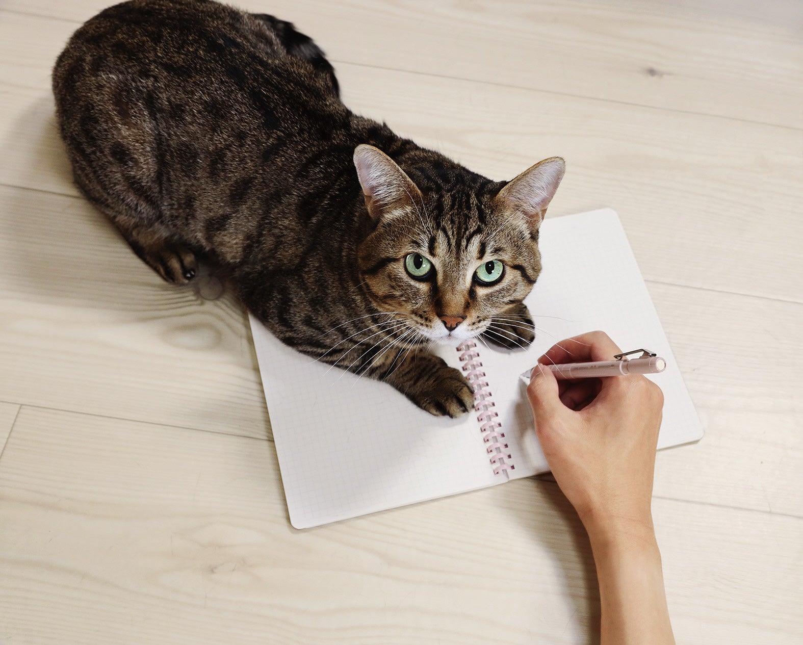 日付記入欄のドットが肉球に。また裏表紙には、犬や猫のシルエットが施されるなど、遊び心のある仕掛けがたっぷり詰まっています。サイズはコンパクトで持ち運びやすいA5サイズをご用意。罫線には、図や表も書きやすい5mm方眼罫を採用しました。