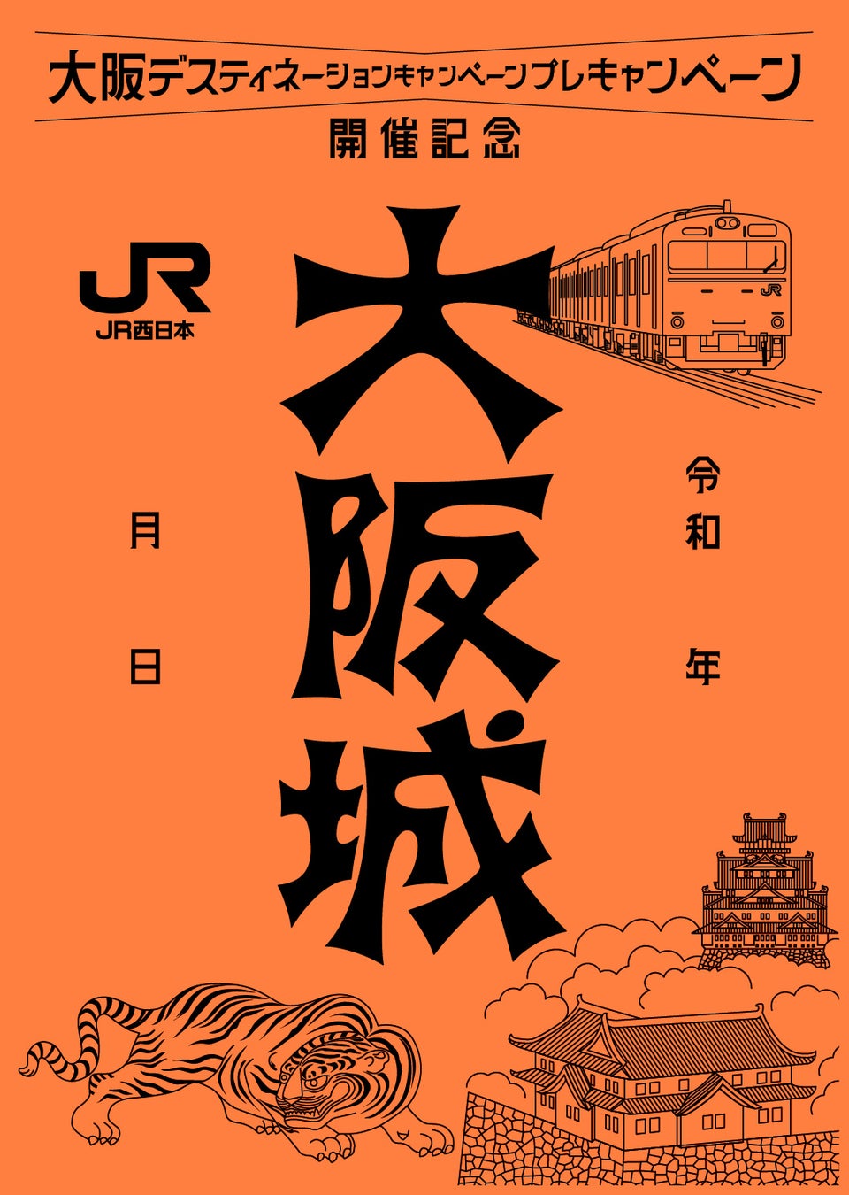 色の電車を彷彿させるようなカラーの用紙に、大阪城と乾櫓、大阪城にゆかりのある伏虎(ふくこ)、103系