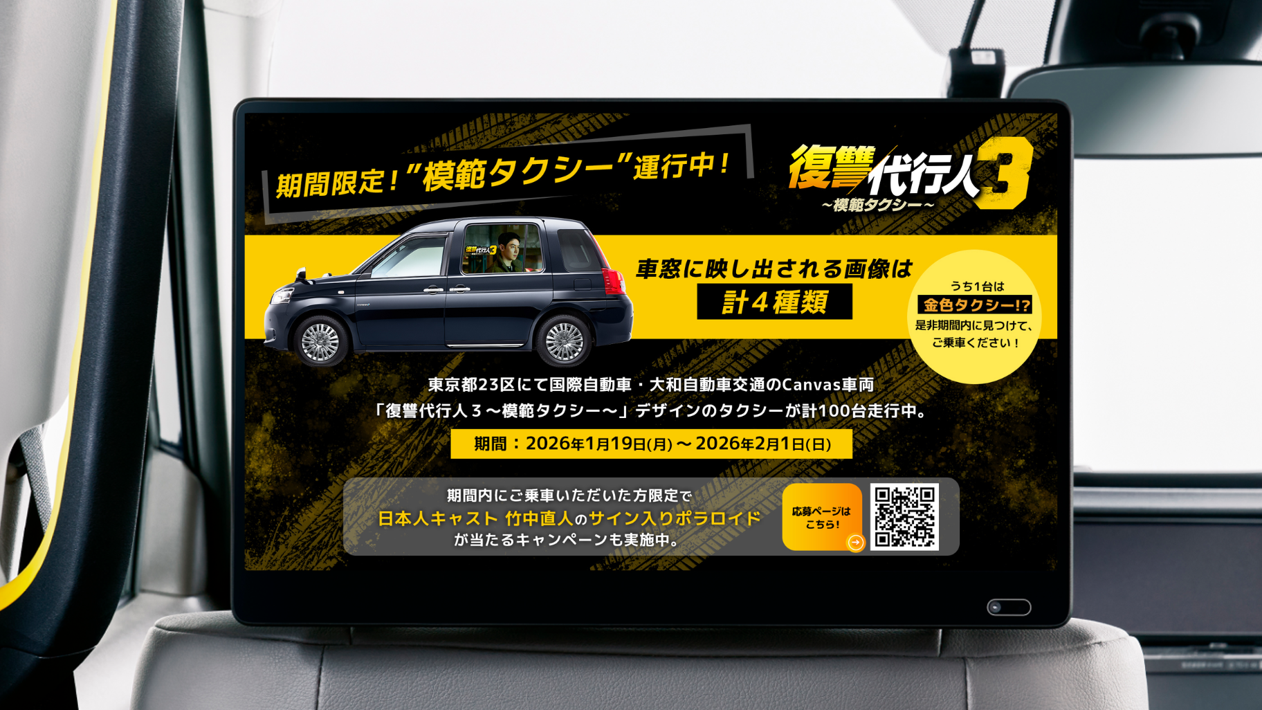 2026年1月19日(月)~2月1日(日)の2週間、「復讐代行人3~模範タクシー~」のドラマオリジナルタクシー計100台が、東京都内(23区・武蔵野/三鷹地区)を走行しました。本施策では、タクシー車体を作品仕様にラッピング。モビリティ車窓メディア「Canvas」では主演俳優イ・ジェフンの迫力あるビジュアルを掲出し、車内のタクシーサイネージメディア「GROWTH」では本施策限定の特別映像を放映しました。