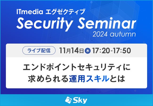 Sky株式会社は、11月14日(木)に開催される、ITmedia エグゼクティブ主催のライブ配信セミナー「ITmedia エグゼクティブ セキュリティセミナー 2024 秋」に協賛いたします。