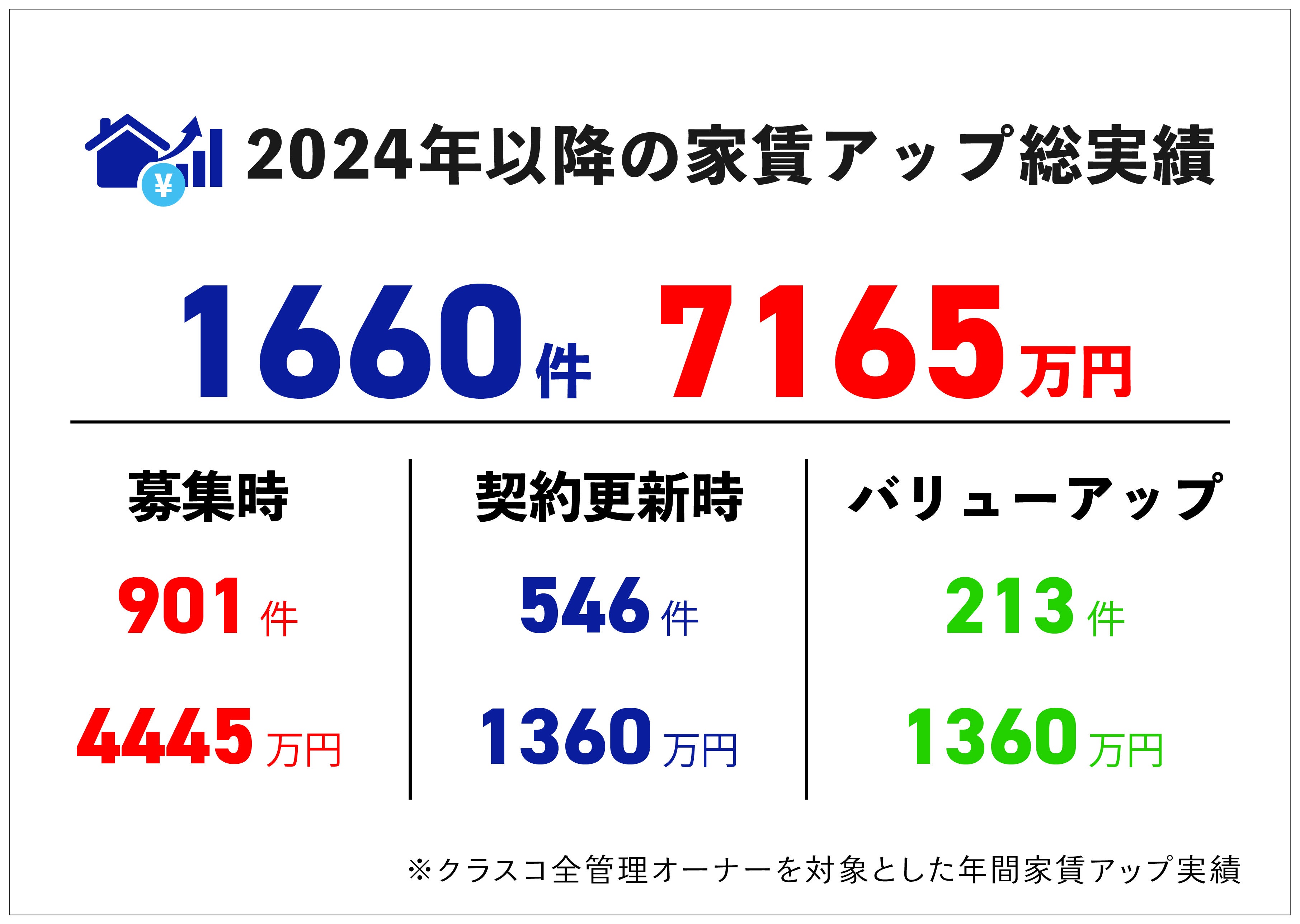 インフレ時代に対応した、物件の募集時や契約更新時、リノベーション等のバリューアップ提案によって、1,600室以上の適切な賃料増額に成功し、オーナー様全体へ年間総額約7,165万円の新たなキャッシュフローを創出しました。