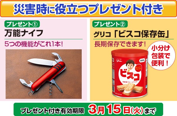 なお3月15日(火)までのキャンペーン期間中にご購入いただくと、災害時に役立つ期間限定プレゼント「万能ナイフ」「グリコ ビスコ保存缶」を差し上げます。