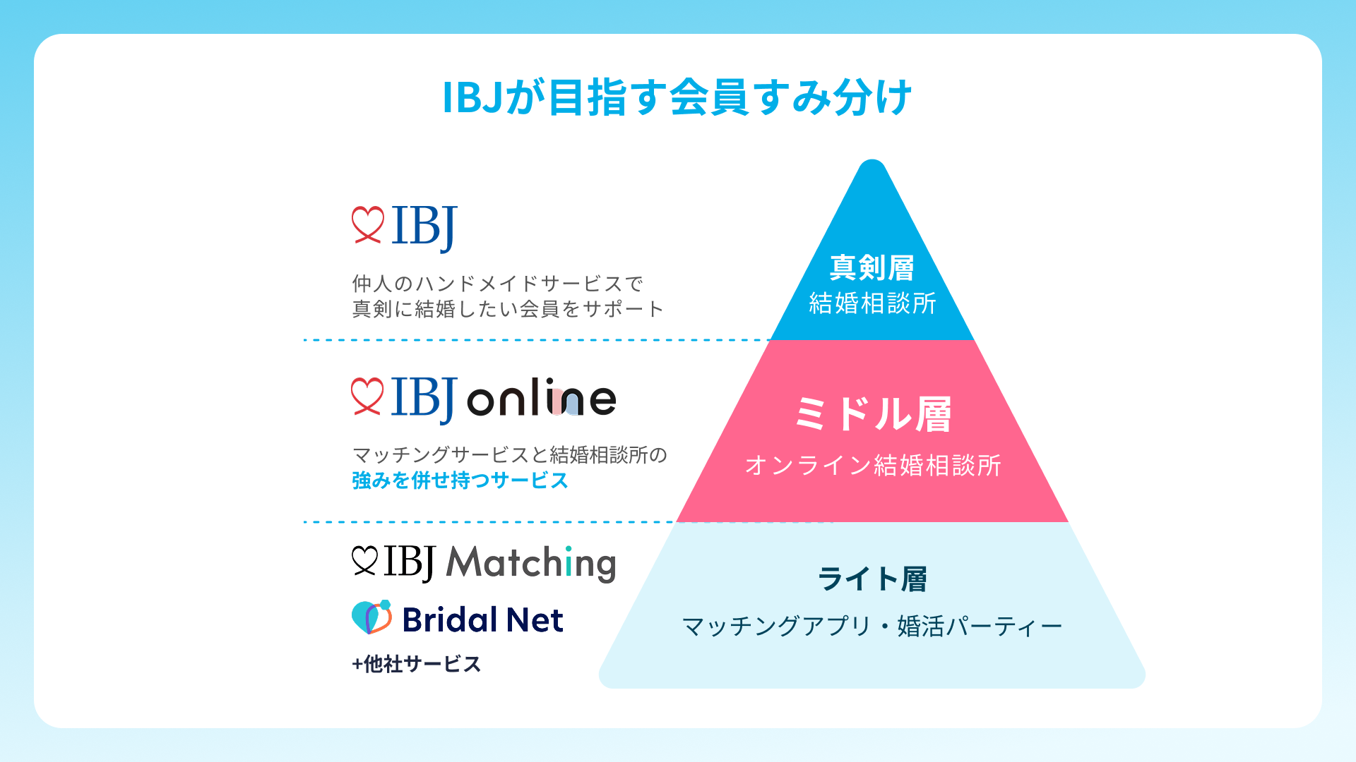 「IBJ online」は、マッチングアプリを利用する「ライト層」と、結婚相談所で活動する「真剣層」の間に位置する、効率と信頼を重視する"婚活ミドル層"にとって最適なオンラインプラットフォームとして進化を続けてまいります。