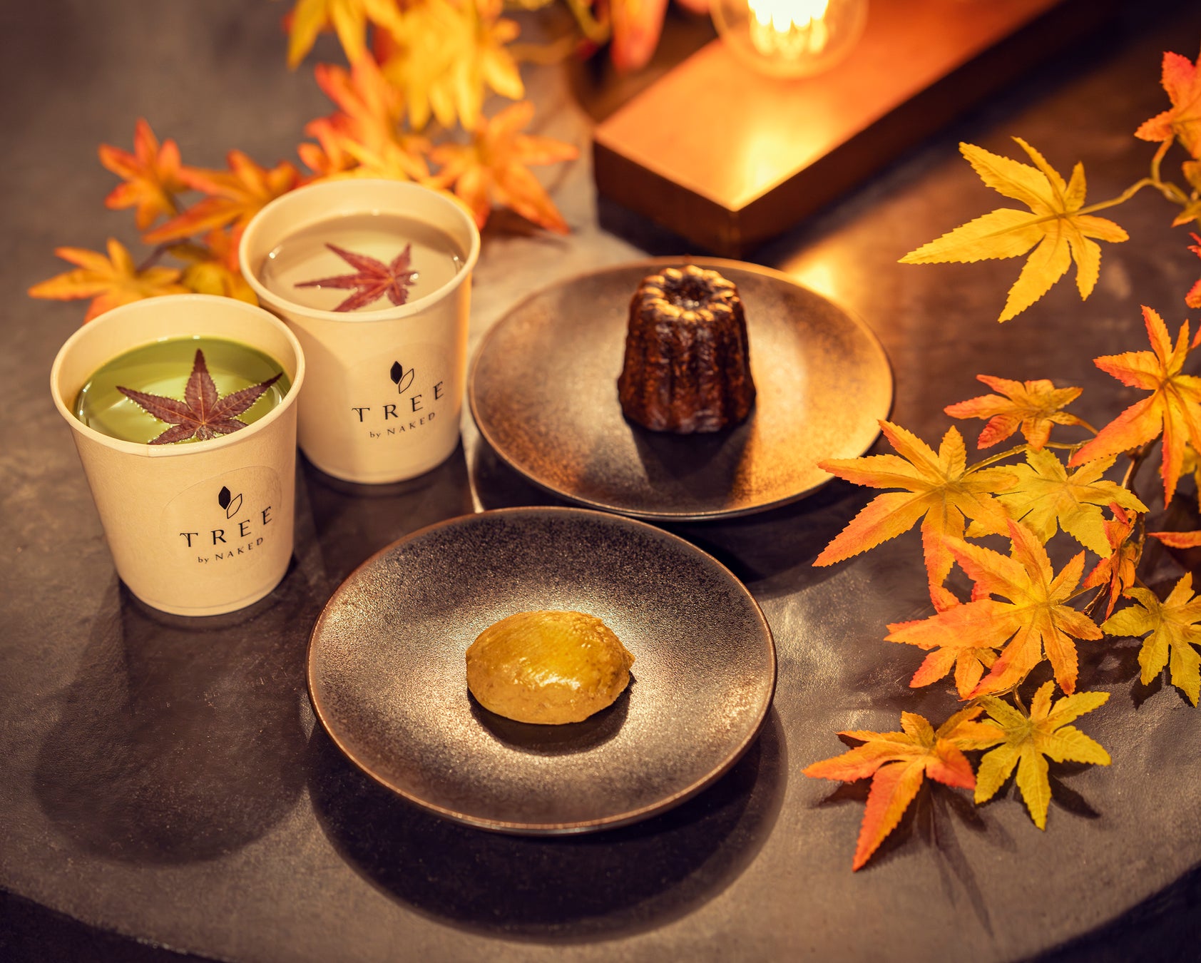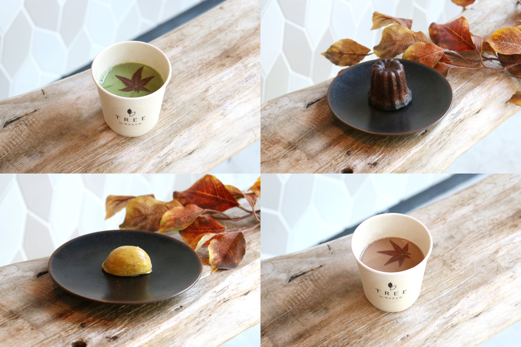 飲食エリアは、日本の秋をテーマに、ネイキッドのフード&ビバレッジチームがプロデュース。人気アートレストラン「TREE by NAKED」のキッチンカーの環境にも人にも優しいヴィーガンメニューを展開。見た目でも秋を感じられる「食べるモミジ」が浮かんだ抹茶豆乳ラテ・ほうじ茶チャイは、京都の老舗茶舗・福寿園の高級茶葉を贅沢に使用。同じく福寿園の茶葉を使用したほうじ茶カヌレや、能登産さつま芋のヴィーガンスイートポテトは片手でも食べやすいサイズでご用意しました。提供時の容器はすべて、環境に配慮したサステナブルな素材を使用しています。