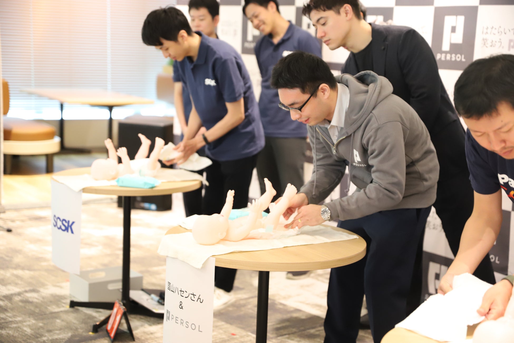 東京都助産師会監修による育児クイズが出題され、国山ハセン氏&パーソルチーム、SCSKチーム、パナソニックコネクトチームの3チームが「育児クイズ王」の座をかけて競い合いました。クイズは、「育児休業は分割して取得できる?(答え:分割して2回取得可能)」、「『愛情ホルモン』と言われ、ママだけではなく、パパも育児をすると分泌されるホルモンは?(答え:オキシトシン)」といった育児に関する知識を問う問題や、赤ちゃん人形を使った「おむつ替え」や「寝かしつけ」などの実技問題も出題され、参加者たちは楽しみながら育児に関する知識を深めていきました。