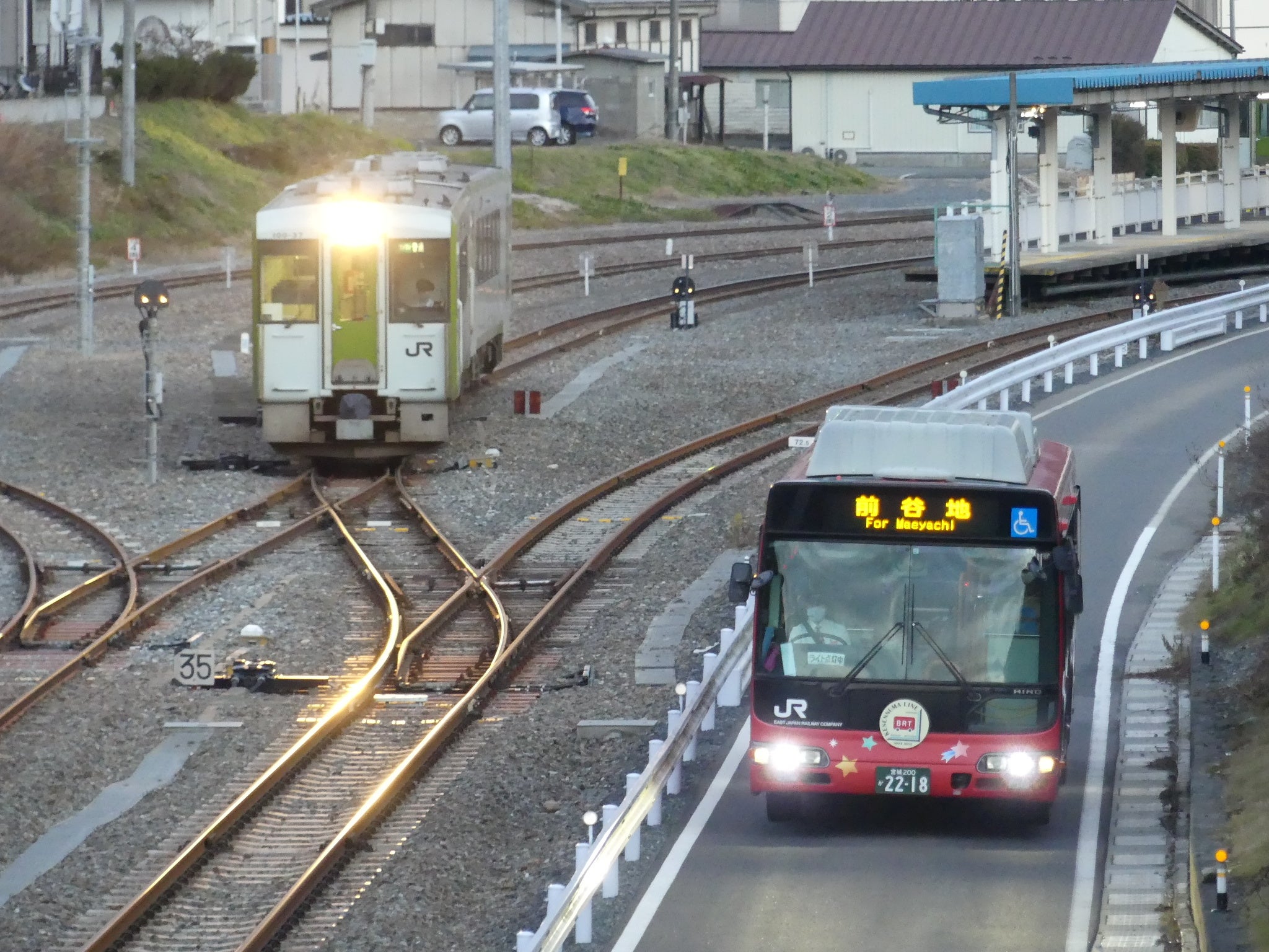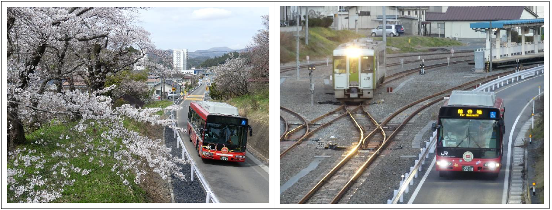 2011年3月の東日本大震災で甚大な被害を受けたJR気仙沼線柳津駅(宮城県登米市)~気仙沼駅(宮城県気仙沼市)間、JR大船渡線気仙沼駅~盛駅(岩手県大船渡市)間の約100kmをBRTとして復旧し、地域の基幹交通として運行中です。鉄道からBRT への転換にあたり、バス専用道の整備による速達性・定時性の確保や、道の駅や役場・病院への乗入れ、新駅の整備、運行本数を増やすことにより利便性を向上させています。