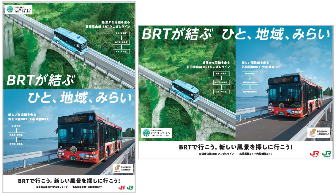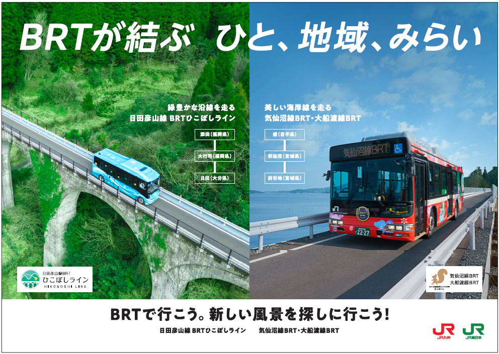 東日本旅客鉄道株式会社(本社:東京都渋谷区、以下「JR東日本」)と、九州旅客鉄道株式会社(本社:福岡県福岡市、以下「JR九州」)では、東北地区及び九州地区の両エリアでBRT(バス高速輸送システム)を運行しています。 このたび、両社ではエリアを越えて連携し、「BRTが結ぶ ひと、地域、みらい」をコンセプトとして、両BRT線を共同でPRする取り組みをスタートします。 東北の美しい海岸線を走る気仙沼線BRTと大船渡線BRT、そして九州の緑豊かな沿線を走る日田彦山線BRTひこぼしラインへの、皆様のご乗車をお待ちしています。 |