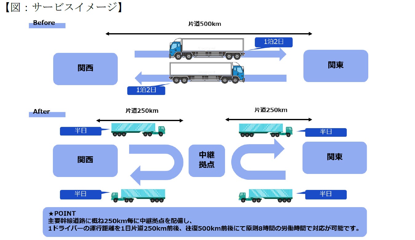 従来型の幹線輸送と異なり、セミトレーラーを活用することで、発着地(例:東京-大阪間)の双方から輸送されてきた荷物を、中継地点で貨物コンテナを車両から切り離して交換することが可能となります。中継地点から当日中に互いの出発地点に戻ることができるため、2024年問題(時間外労働上限規制適用から生じる諸問題)で課題となっているトラックドライバーの拘束時間の削減に貢献することができます。