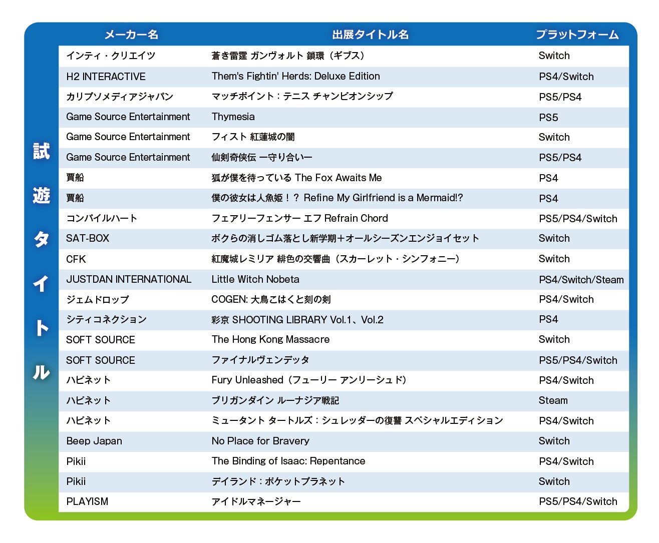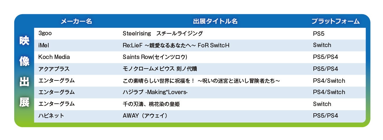 ※『INFOLENS GEEK SHOP』『Fangamer Japan』各社出展タイトルにつきましては、上記ゲームタイトルラインナップをご確認ください。