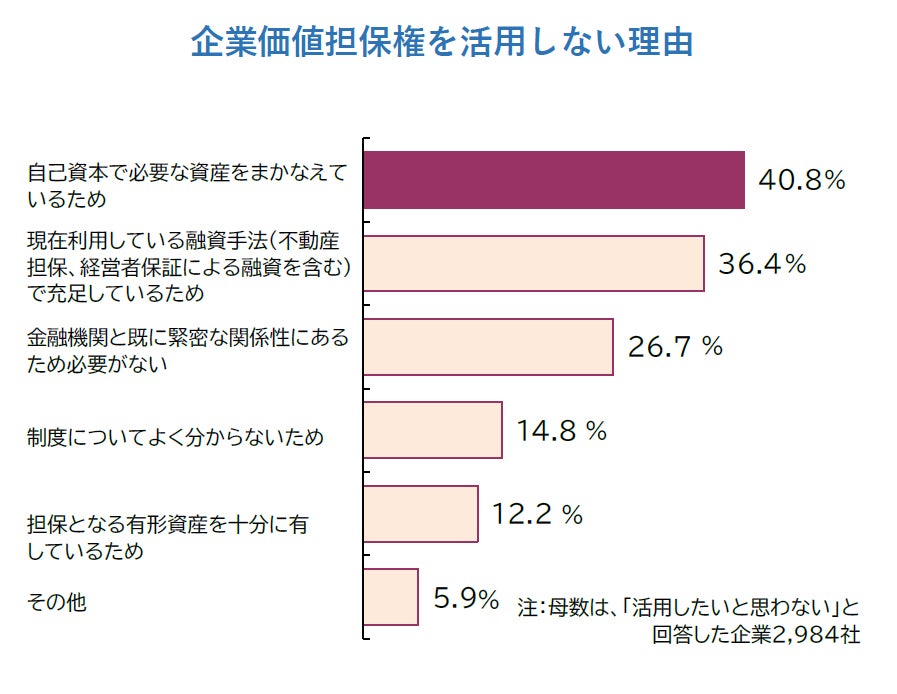 企業価値担保権を活用したいと思わない企業に対して、その理由を尋ねたところ、「自己資本で必要な資産をまかなえているため」とする企業が40.8%で最も高くなった。