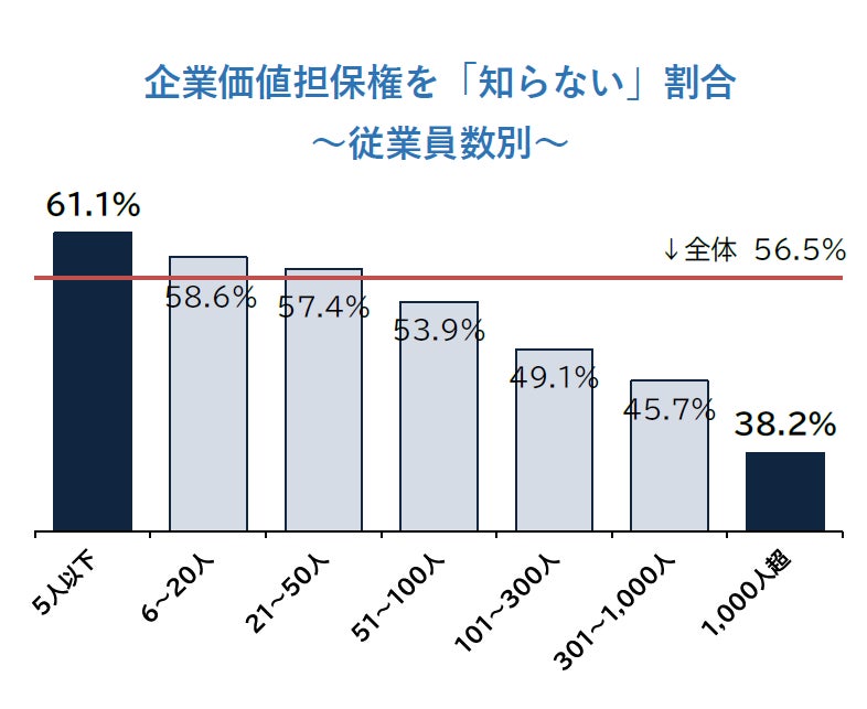 また、企業価値担保権を「知らない(名前も聞いたことがない)」割合を従業員数別にみると、「1,000人超」の企業では38.2%と3割台だった。しかし、従業員の規模が小さくなるほどその割合は高まっていき、「21~50人」(57.4%)や「6~20人」(58.6%)の企業で全体の割合を上回った。とりわけ「5人以下」の企業では61.1%と6割を超えた。