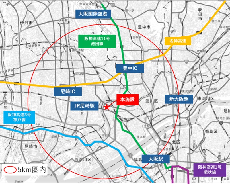 また、本施設が位置する淀川区は、人口・世帯数ともに大阪市内最大(※3)で、本施設の周辺5㎞圏内には約81万人が居住しており、物流施設の雇用確保やラストマイル配送にも有利な立地です。10km圏内には大阪梅田等の大阪中心エリアや、工場が集積する尼崎エリアがあり、また、阪神高速11号池田線「加島料金所」まで約2.2㎞、名神高速道路「尼崎IC」まで約4㎞、名神高速道路「豊中IC」まで約5.4㎞(※4)と関西全域への配送に非常に適しています。加えて、本施設はJR東西線「加島」駅から徒歩約4分と、従業員の通勤利便性に非常に優れています。