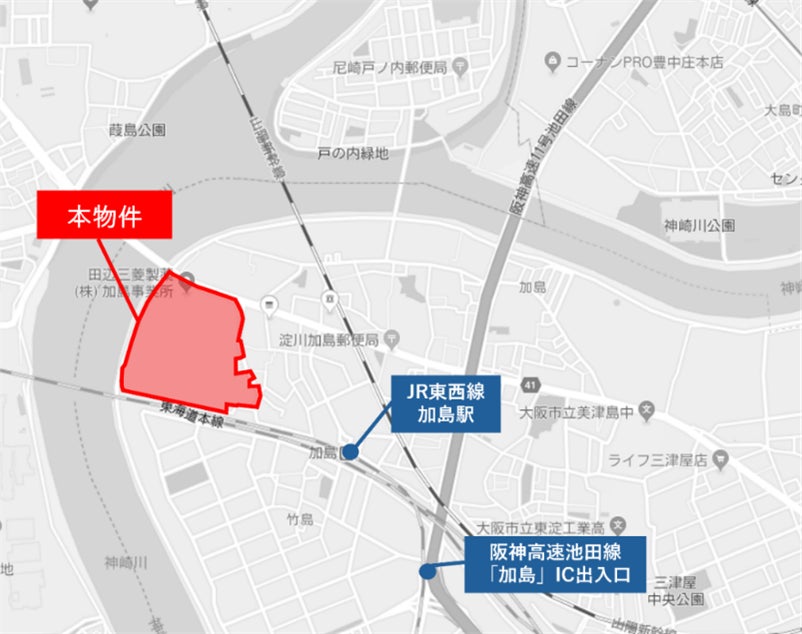 名神高速道路「豊中IC」 約5.4km/「尼崎IC」約4km 阪神高速11号池田線「加島料金所」約2.2㎞ JR東西線「加島」駅より 徒歩 約4分 |