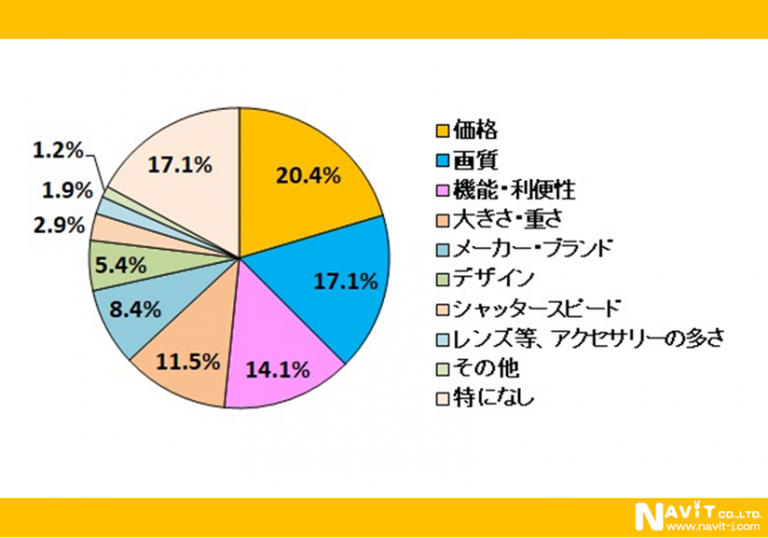 デジカメを選ぶときのポイントは「価格」「画質」「機能・利便性」のトップ・スリーを合わせると、回答数の51.6%を占めています。「メーカー・ブランド」で選ぶ人は回答数の8.4%にとどまっています。