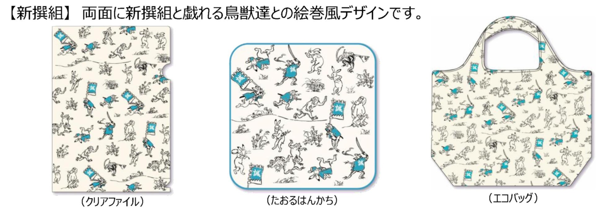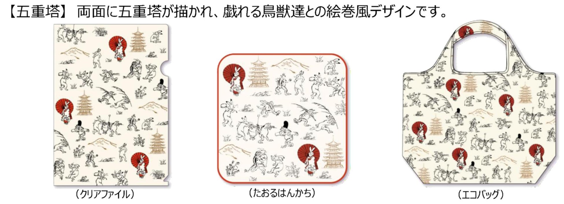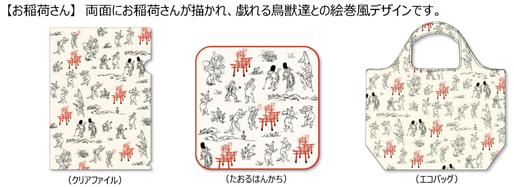 今回は「京都」をテーマに、新撰組・お稲荷さん・五重塔が描かれた鳥獣戯画コラボシリーズグッズを販売いたします。 3柄3商品の全9商品を、一部店舗で販売いたします。