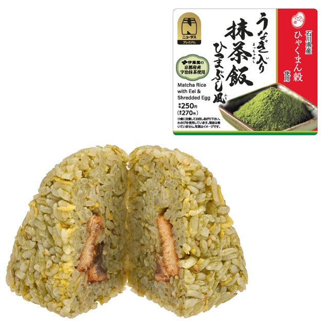 伊藤園の京都府産宇治抹茶を使用した抹茶飯で、うなぎと刻みわさびを包みました。抹茶の味わいと、わさびの風味で楽しむひつまぶし風のおにぎりです。