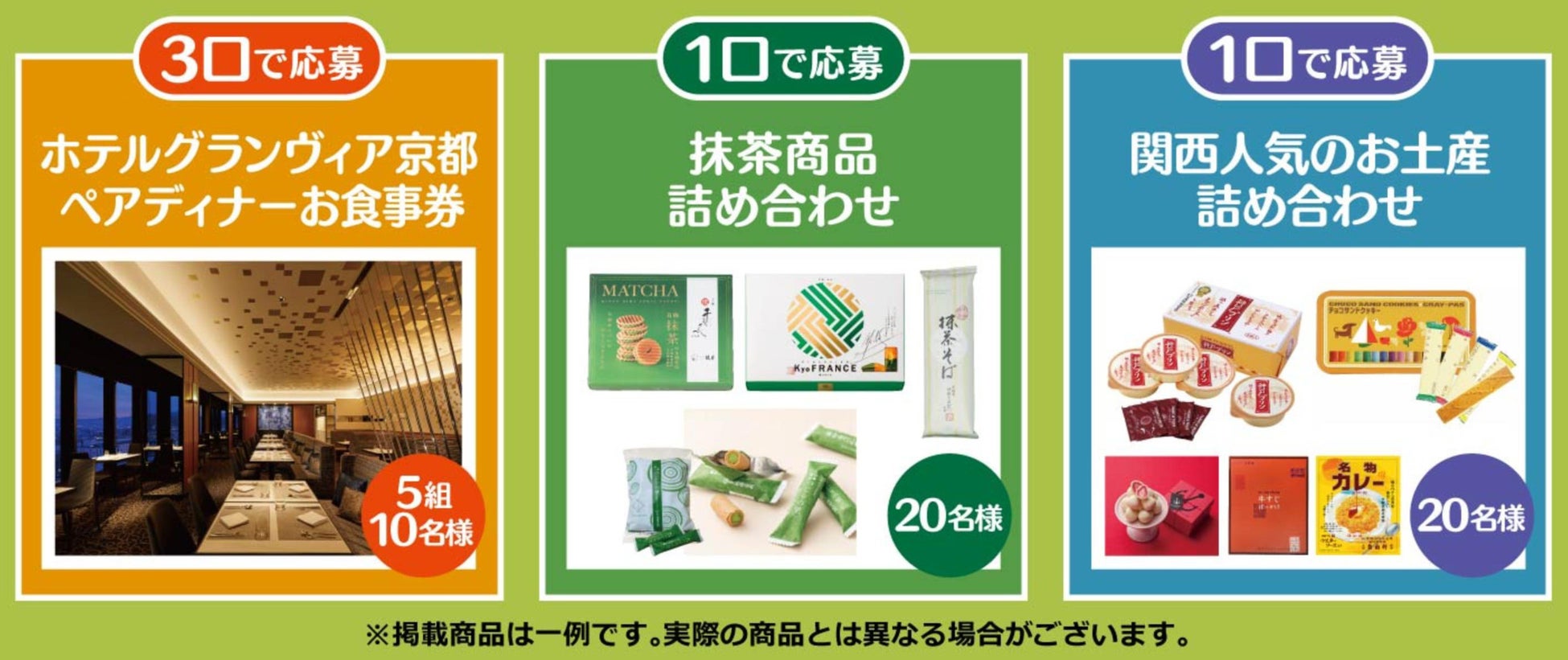 期間中は、 「関西&北陸うまいもんめぐり」対象商品1品以上を含む、700円(税込)以上ご購入のレシートに発行されるIDでご応募いただくと、「ホテルグランヴィア京都 ペアディナーお食事券」など関西の❝うまいもん❞が抽選で当たるプレゼントキャンペーンを実施いたします。