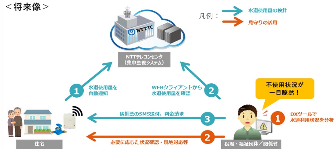 中富良野町においても遠隔水道検針の実現により、そのデータを活用し、高齢独居世帯を緩やかに見守る仕組みづくりについて、中富良野町、NTT東日本、NTTテレコンが連携し検討・実証を開始します。