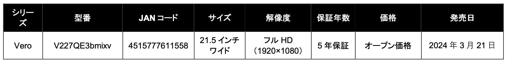 日本エイサー株式会社(本社:東京都新宿区、代表取締役社長:ボブ・セン)は、Acerの統合的なサステナビリティに考慮した取り組みを具現化するサステナブルな製品シリーズAcer Vero(ヴェロ)より、法人市場に向けて、21.5インチスタンダードモニター「V227QE3bmixv」を本日2024年3月28日より発売します。地球環境に配慮したVero製品は発売以来、法人のお客様から多くのお問い合わせをいただいており、充実したラインアップと保証内容をご提供するべく、通常3年保証のところを本製品は5年保証※1に延長しています。