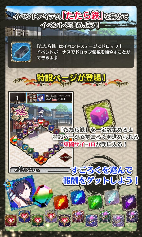 イベントステージを遊ぶと獲得できるイベントアイテム「たたら鉄」を集めることで、イベントを進めることができます。
