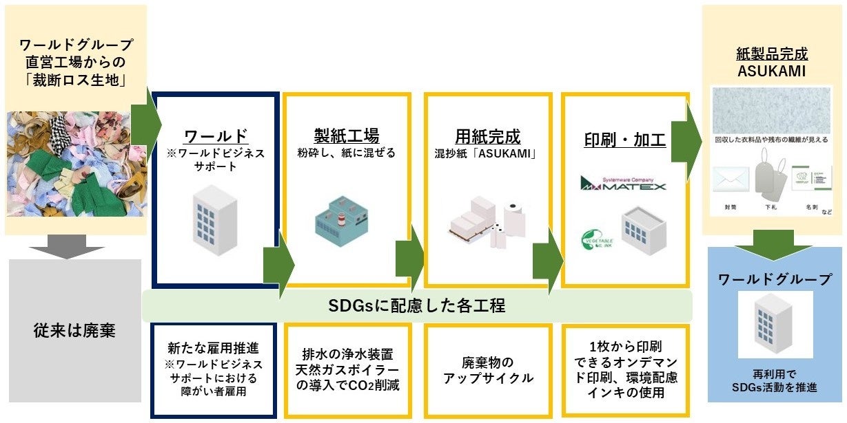 縫製時の「裁断ロス生地」を紙製品にアップサイクル 混抄紙(こんしょうし)「ASUKAMI」との取組みスタート ―ワールドグループ商品の下げ札や名刺、紙製品で再利用―