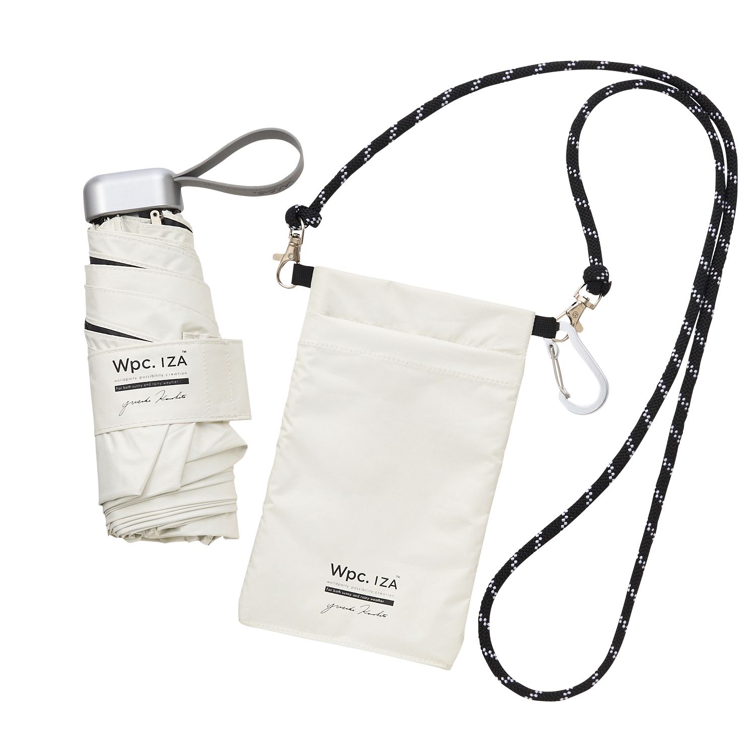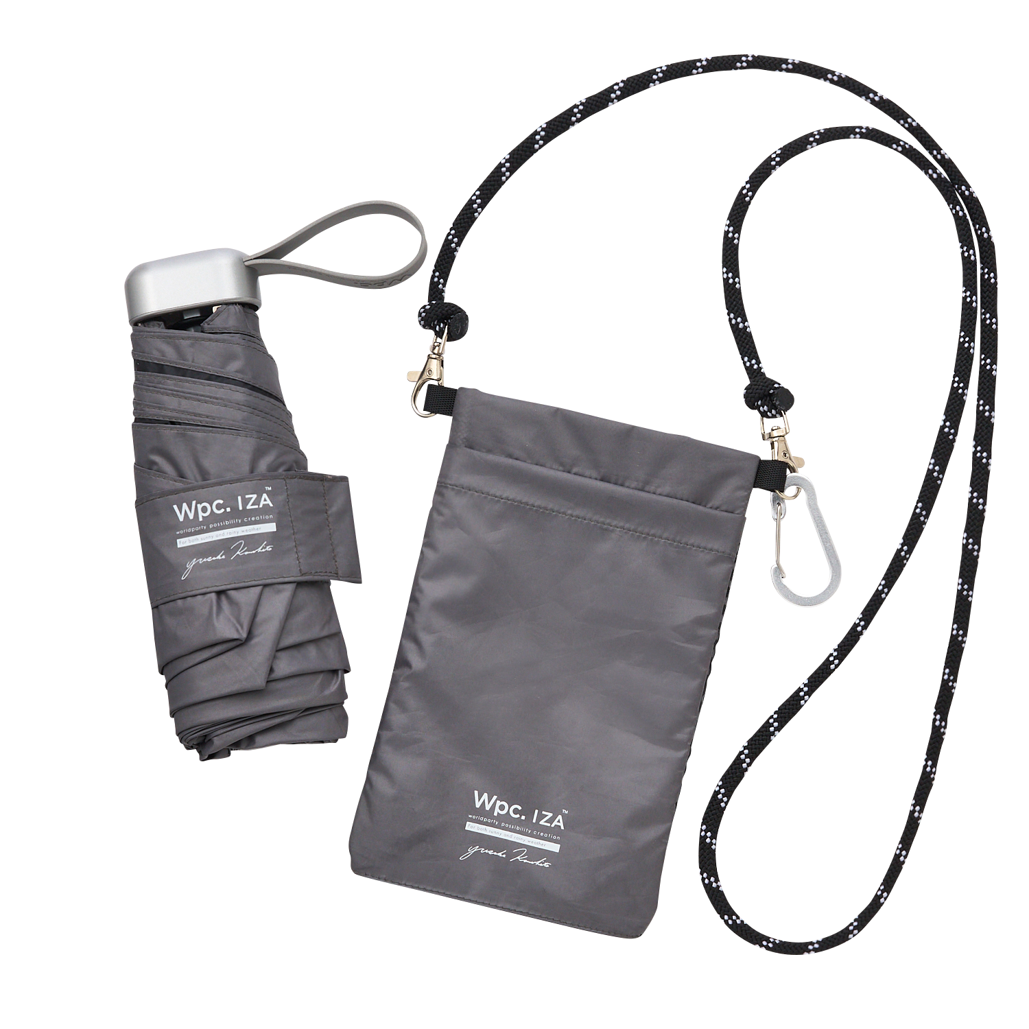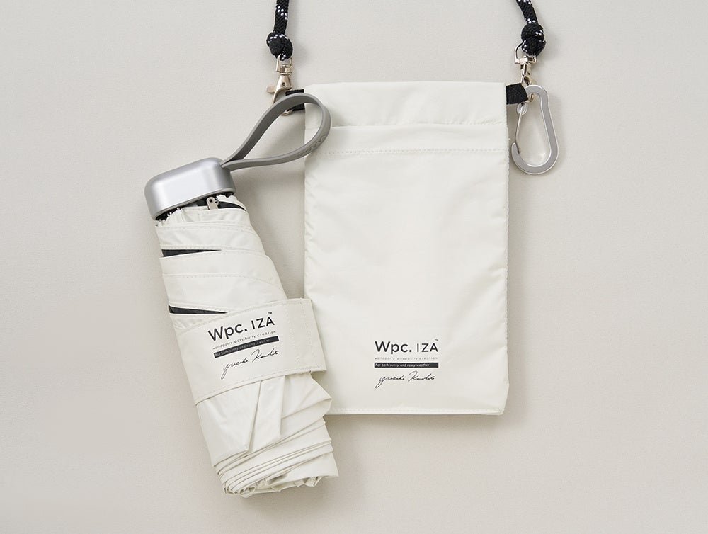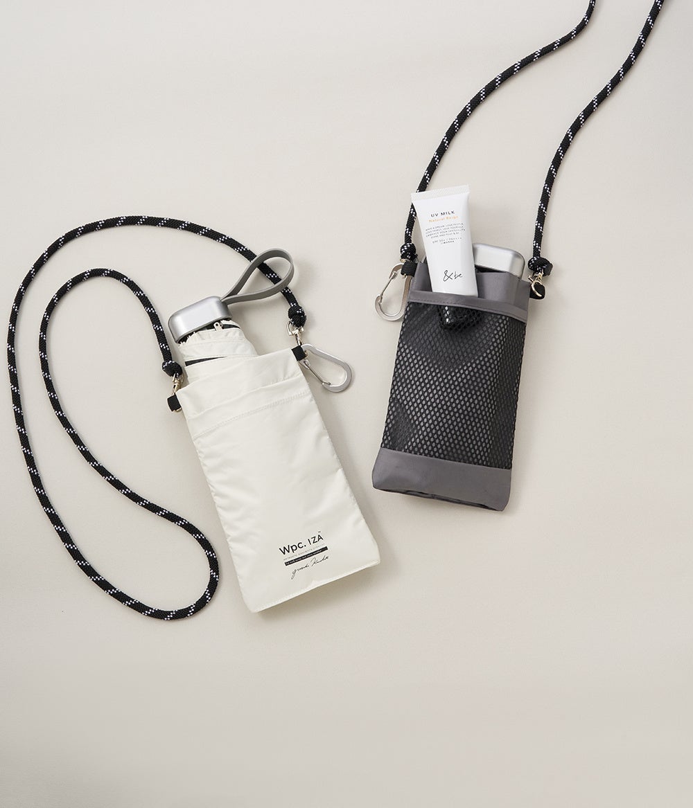 Wpc. IZAシリーズ史上初めて、持ち手部分にシルバー・ラバー部分にグレーカラーを使用し、シンプルな日傘に「格好良さ」をプラス。手ぶらの時にも持ち歩きたいという河北氏の想いから、ショルダーポーチ付きで肩から掛けて持ち運べる仕様です。ポーチにはカラビナもついているため、ショルダーをはずしてベルトループやバッグ等に直接つけて持ち運ぶことも可能!さらに、ポーチの両面にポケットが付いているのも嬉しいポイントで、日焼け止めやリップなど、細かいものの収納もでき、何通りにも使えます。
