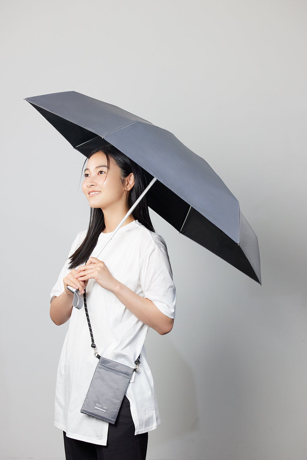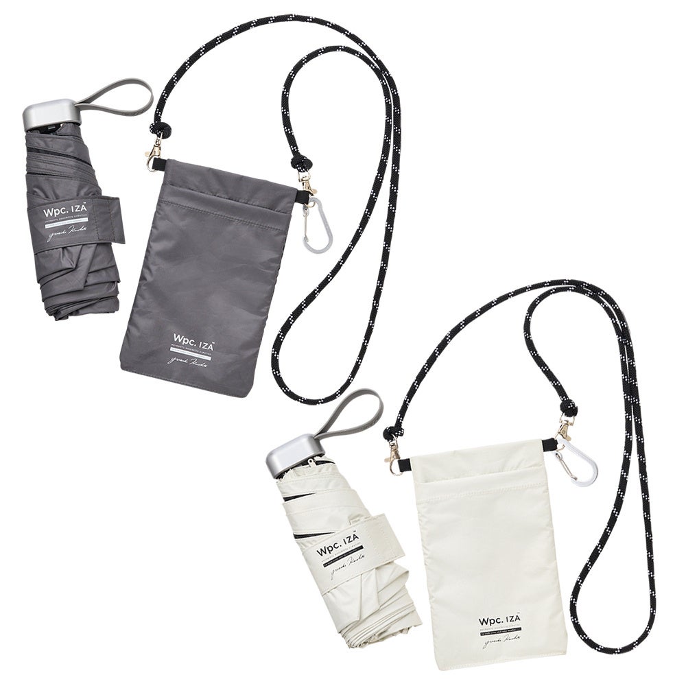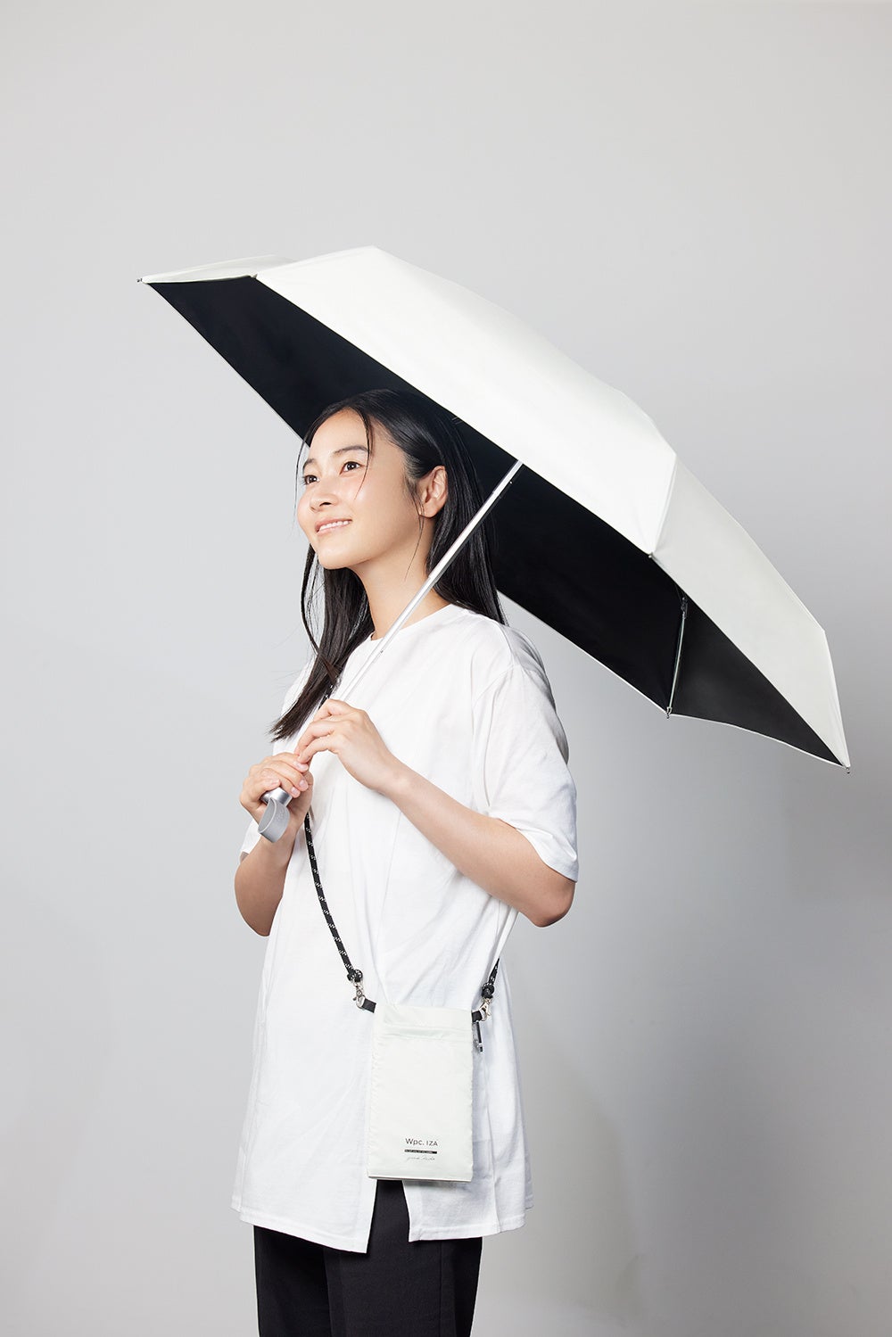 Wpc. IZAシリーズ史上初めて、持ち手部分にシルバー・ラバー部分にグレーカラーを使用し、シンプルな日傘に「格好良さ」をプラス。手ぶらの時にも持ち歩きたいという河北氏の想いから、ショルダーポーチ付きで肩から掛けて持ち運べる仕様です。ポーチにはカラビナもついているため、ショルダーをはずしてベルトループやバッグ等に直接つけて持ち運ぶことも可能!さらに、ポーチの両面にポケットが付いているのも嬉しいポイントで、日焼け止めやリップなど、細かいものの収納もでき、何通りにも使えます。