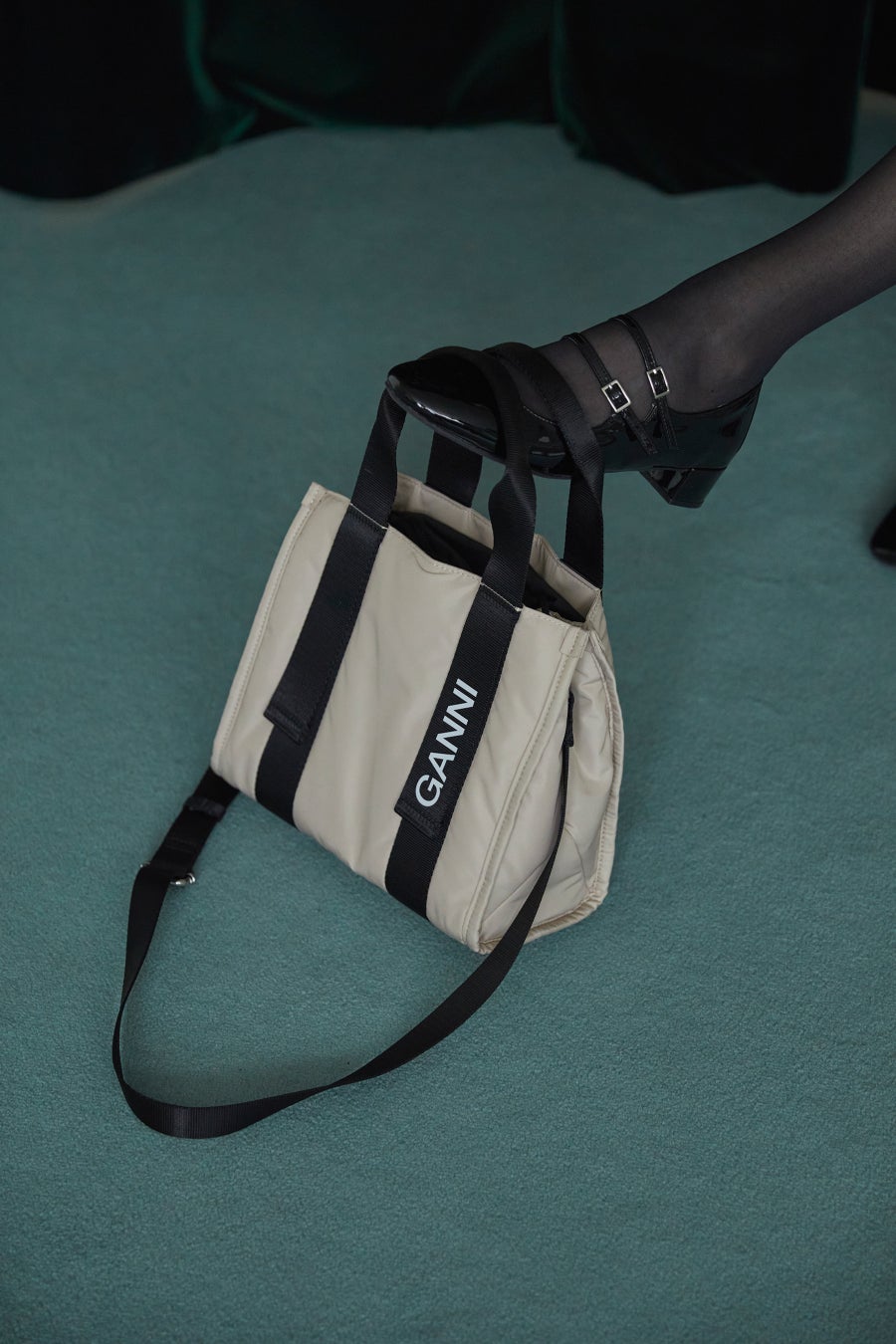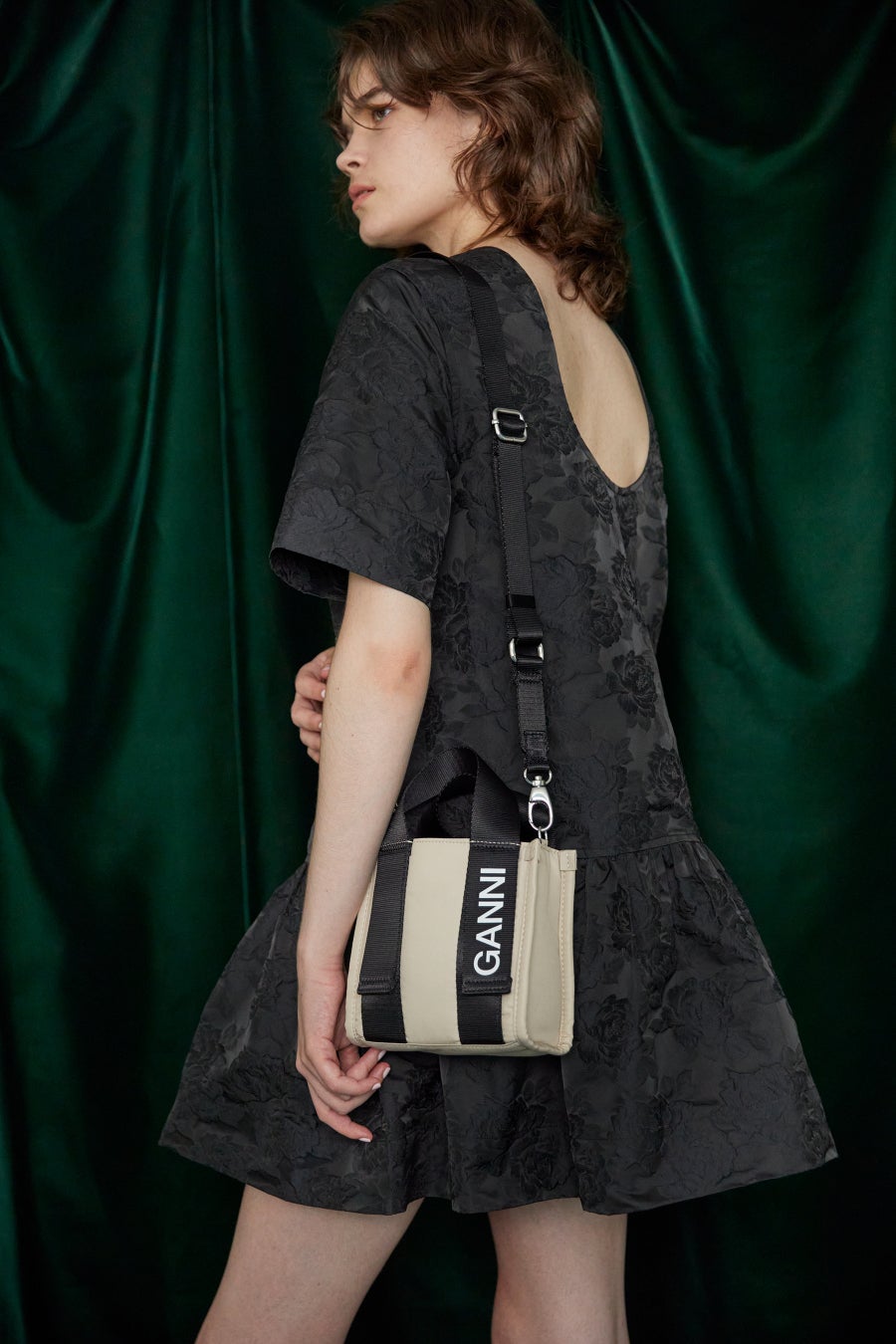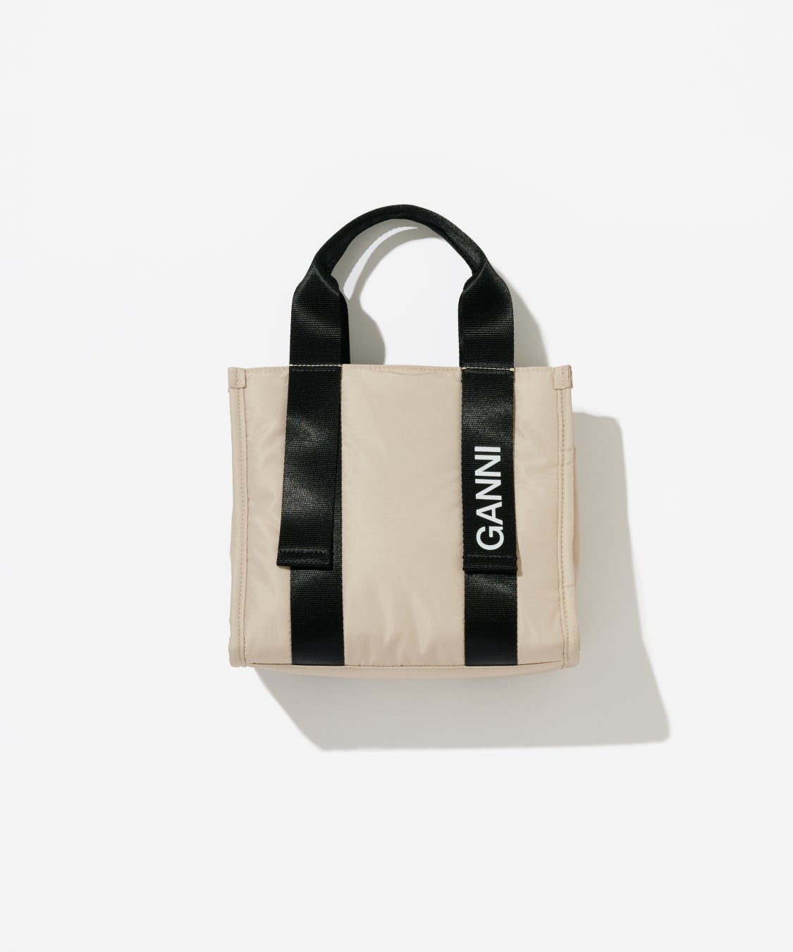 ハンドル部分にGANNIのブランドロゴが入ったアイコニックなデザインのミニトートバッグ。