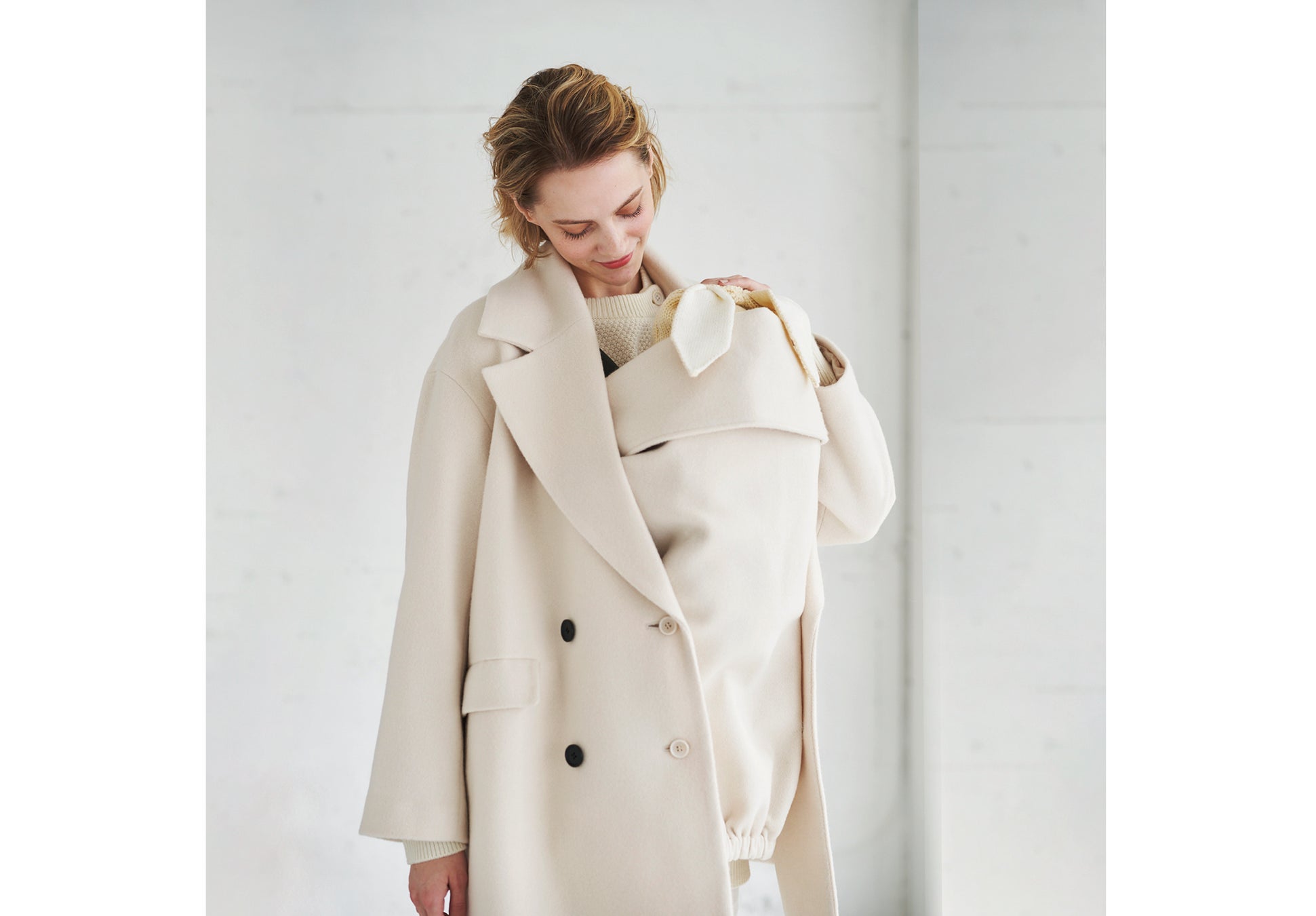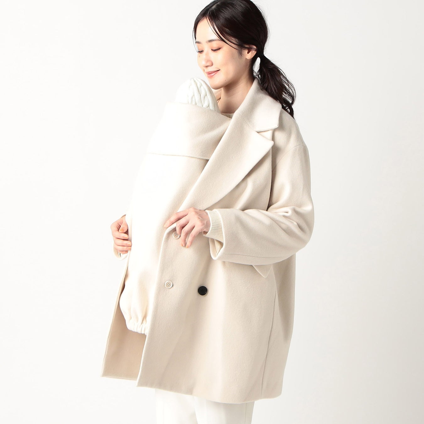 抱っこ布を装着してママコートとしても着用できる!コムサ・ブロンドオフからウールコートが登場