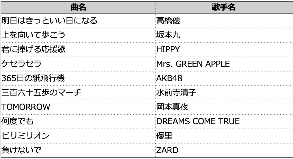 復興応援課題曲は、過去の災害時に全国カラオケ事業者協会が行った「応援歌アンケート」とジャンル別ランキング等をもとに選曲しました。