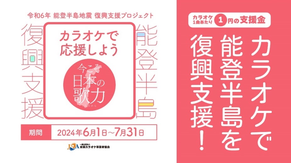 株式会社第一興商は、“能登半島地震による被害からの復興支援と1日も早い回復を願うことから、一般社団法人全国カラオケ事業者協会(以下、全国カラオケ事業者協会)が2024年6月1日から7月31日まで展開するプロジェクト「カラオケで応援しよう~今こそ日本の歌力~」に協力します。
