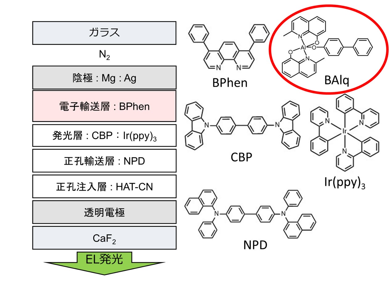 まず、測定試料として図2に示す構造を持つ有機EL素子(OLED1)を基準として、素子を構成する材料を変えることで、電流―電圧特性の違いが小さい素子(OLED2)と、大きく異なる素子(OLED3)の3種類の有機EL素子を作製しました。それぞれに対してESFGの電圧応答を測定したところ、OLED1と2では、内部の電位分布が異なっており、OLED2は電流―電圧特性の低いOLED3に近いものとなっているということがわかりました。OLED2とOLED3は、共通してBAlq(図2右上、赤丸の分子)という有機物を発光層と電子輸送層の間に挿入していますが、このBAlqを用いた素子は、実は素子の輝度寿命が長くなることで知られています。このBAlq層を有機EL素子に加えることにより、素子内部の、特に正孔輸送層に加わる電位分布の状態が変化して、各有機層の電位バランスが変わっていることがわかりました。