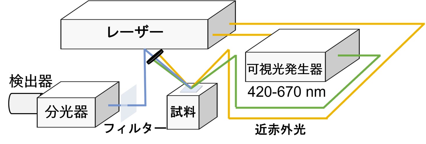 本研究では、このSFG分光装置を改良し、新たに界面の電子スペクトルを取得するための「電子和周波発生分光(ESFG分光(図1))」を可能にした技術を開発しました。この手法は、波長を自在に変えることのできる可視光と近赤外光を試料に照射することで、物質界面での紫外可視吸収スペクトルを選択的に取得することができる手法です。さらに試料に電界が生じている際には、その電界の大きさや向きに応じて信号強度が変化する「電界誘起効果」を利用することで、複雑な構造を持つ有機ELをはじめとする有機デバイスを駆動した際の内部の電荷移動状態をリアルタイムで計測・解析することが可能です。