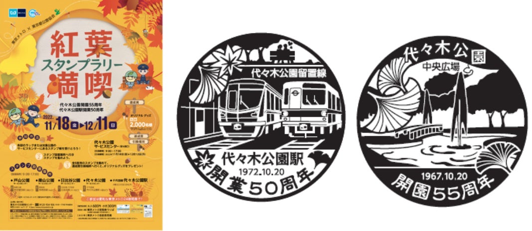このスタンプラリーは、代々木公園駅開業50周年・代々木公園開園55周年を迎えたことを記念して実施します。東京メトロ沿線にある公園協会管轄の代々木公園、日比谷公園、戸山公園及び青山公園と東京メトロ代々木公園駅をめぐり、スタンプを集めると、先着2,000名様に東京メトロと公園協会のオリジナルグッズセットをプレゼントします。