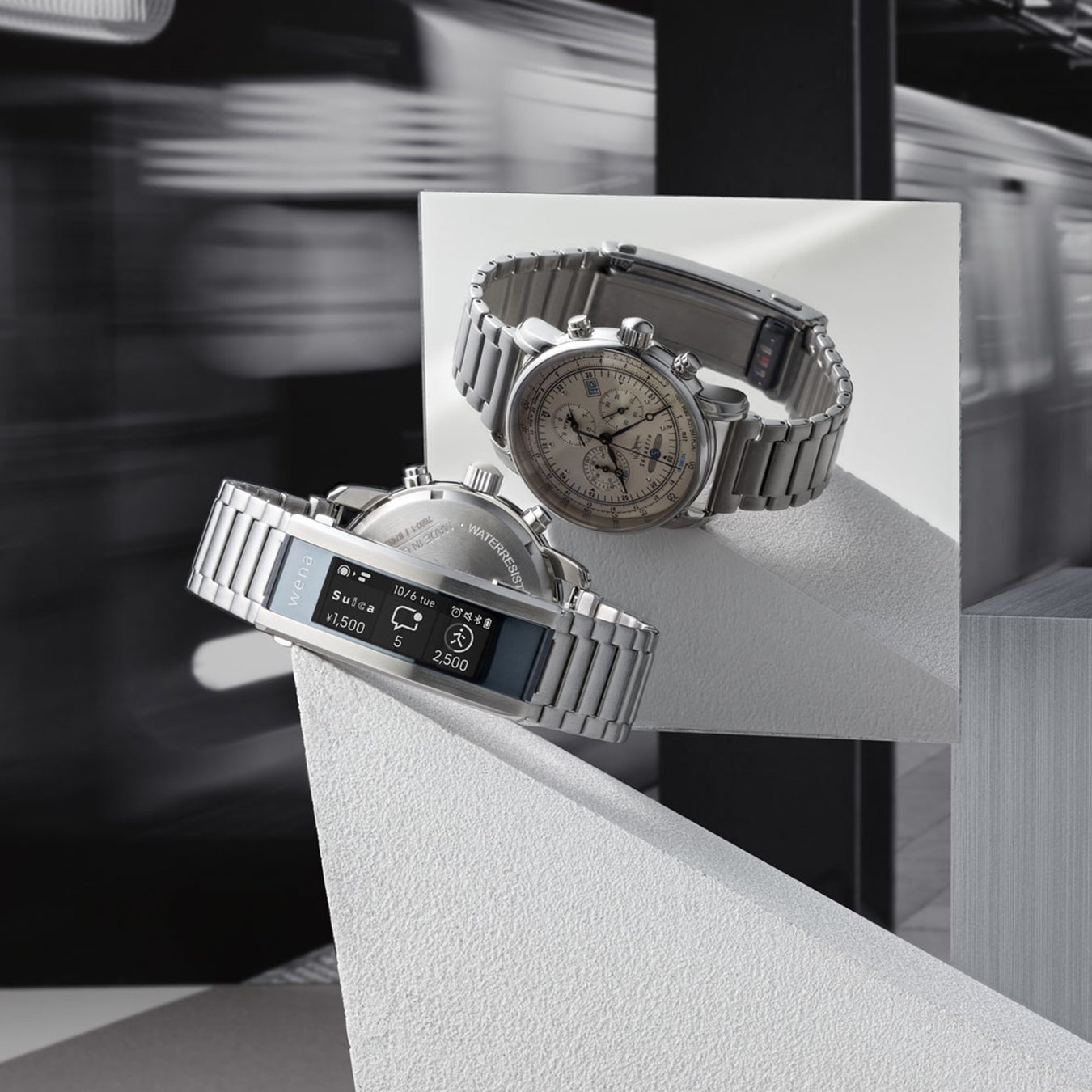 手首側ベルト部分にはソニーの「wena 3 metal」を搭載し、Suica等の電子マネー機能、Amazonの音声サービス「Alexa」、メールの確認、ウェルネス機能、施錠・解錠機能など、便利なスマートウォッチ機能を備えます。