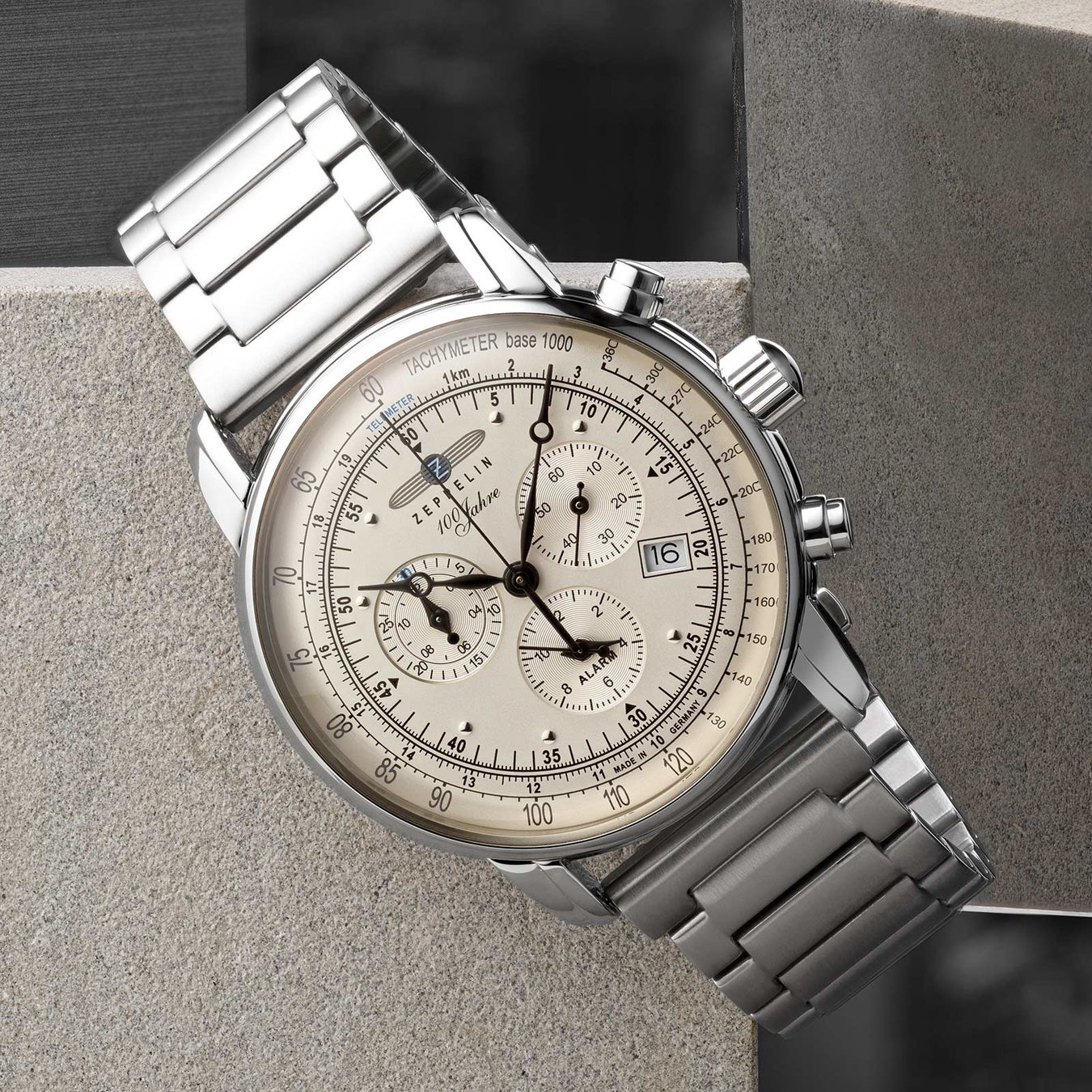 文字盤にはドイツ語で「100周年」を意味する「100Jahre」のロゴが刻まれ、アイデンティティを主張します。
