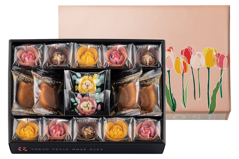 チューリップローズの世界を満喫できるお詰合せ。華やかな代表作『チューリップローズ』、可憐なローズボール『ローズガーデン』、最新作『チューリップローズ フィナンシェ』の入ったギフトボックスです。