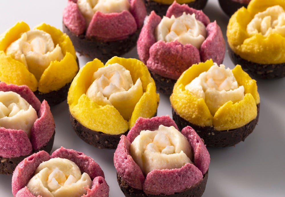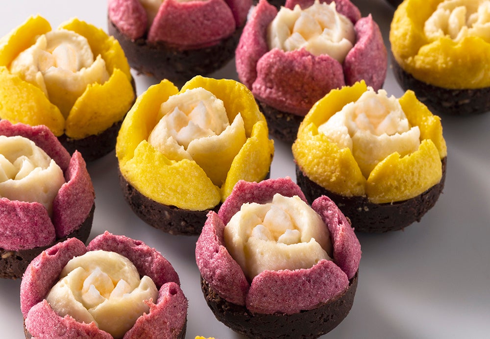 ストロベリー&ラズベリーが甘酸っぱい『ベリー』、深みあるキャラメルマキアートのコクが広がる『キャラメルナッツ』、楽園のパッションフルーツ&マンゴー香る『パッションマンゴー』の3種類。一輪ごとに贅沢な美味しさが口いっぱいに広がる、まさに“スイーツの花園”を楽しめる一品です。