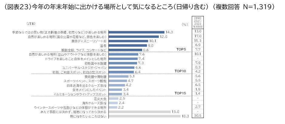 今年の年末年始に旅行や日帰りで出かける場所として、どのような所が気になっているか聞いてみました。「季節ならではの買い物が楽しめる場所(14.3%) 」が最も高く、次いで「自然が楽しめる場所(国立公園や花畑など景観を楽しむ)(12.8%)」、「東京ディズニーリゾート🄬(10.1%)」となりました(図表23)。