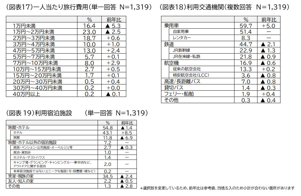 一人当たりの旅行費用:「1万円~2万円未満(23.0%、前年比▲2.5ポイント)」が最も多く、次いで「2万円~3万円未満(18.7%、同+0.6ポイント)」「1万円未満(16.4%、同▲5.3ポイント)」となりました。2万円未満は7.8ポイント減少した一方で、2万円以上は「40万円以上(0.2%、同▲0.1ポイント)」を除くすべての項目で増加し、特に「4万円~5万円未満」、「7万円~10万円未満」で高い増加率となりました(図表17)。