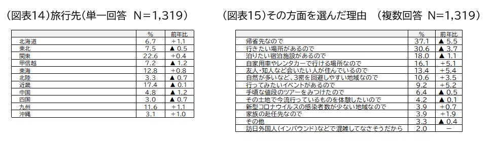 その方面を選んだ理由は「帰省先なので(37.1%)」が最も高くなりましたが、前年より5.5ポイント減少しました。続いて「行きたい場所があるので(30.6%、同▲3.7ポイント)」「泊まりたい宿泊施設があるので(18.0%、同▲1.1ポイント)」と、いずれも昨年より減少しました。「自家用車やレンタカーで行ける場所なので(16.1%、同+5.1ポイント)」「自然が多いなど、3密を回避しやすい地域なので(10.6%、同+3.5ポイント)」「新型コロナウイルスの感染者数が少ない地域なので(3.9%、同+0.7ポイント)」など、感染症防止策を意識した選択肢が引き続き増加している一方で、「友人・知人など会いたい人が住んでいるので(13.4%、同+5.4ポイント)」「行ってみたいイベントがあるので(9.2%、同+5.2ポイント)」など、個人の興味に関わる項目が増加しました(図表15)。