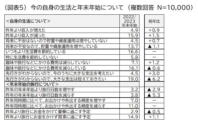 JTBが実施したアンケートで、自身の生活と年末年始の旅行について当てはまる状況を聞いたところ、自身の生活では「いつもより生活費を節約している」は16.6%となりました。一方で「趣味や旅行などにかける費用は減らしていない(7.1%)」は2021年度調査から1.2ポイント増加、「先行きがわからないので今のうちに大きな支出を考えたい(4.5%)」は3.0ポイント増加するなど、物価高への対応はする一方でメリハリをつけて欲しいものには消費する層も一定数いると言えそうです。年末年始の旅行については、「昨年より旅行にお金をかけず質素に過ごす予定(14.9%)」は昨年より1.1ポイント増加しました。また「昨年同時期に比べてお出かけや外出する頻度を減らす」が11.0%と「増やす」より多くなりました(図表5)。