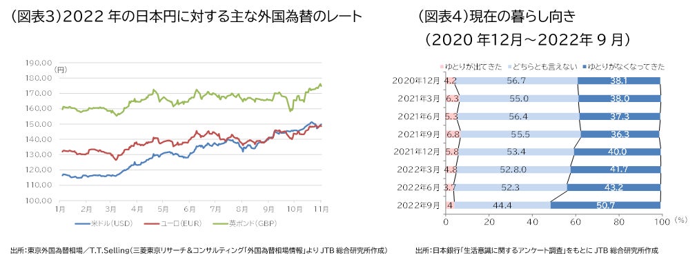 日本銀行の「生活意識に関するアンケート調査」の「現在の暮らし向き(ゆとり)」をみると、「ゆとりがなくなってきた」の割合は、2021年9月以降、それまでの横ばいから増加しており、2022年9月には前年同月比14.4ポイント増加の50.7%になりました。生活のゆとり意識は悪化しています(図表4)。
