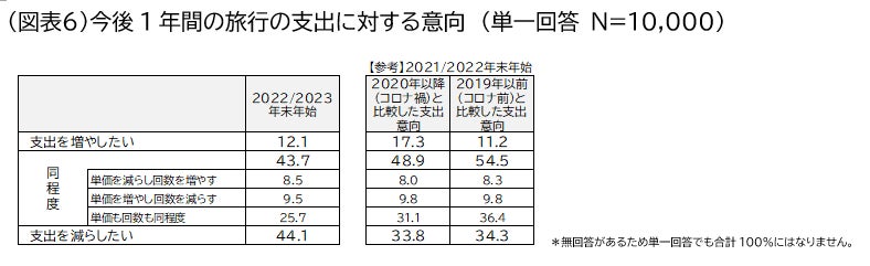 「今後1年間の旅行の支出に対する意向」を聞いたところ、「支出を増やしたい」と回答した人は12.1%で、2021年度調査において、「コロナ禍(2020年以降)より旅行支出を増やしたい」と回答した17.3%から5.2ポイント減少しました。「支出を減らしたい(44.1%)」は同調査(33.8%)から10.3ポイント増加しました(図表6)。2020年の年末が新型コロナ感染拡大期だったことから、昨年はその反動を受け「旅行日数を増やす」「支出を増やしたい」が大きく増えていましたが、今年は落ち着きを取り戻した結果となりました。