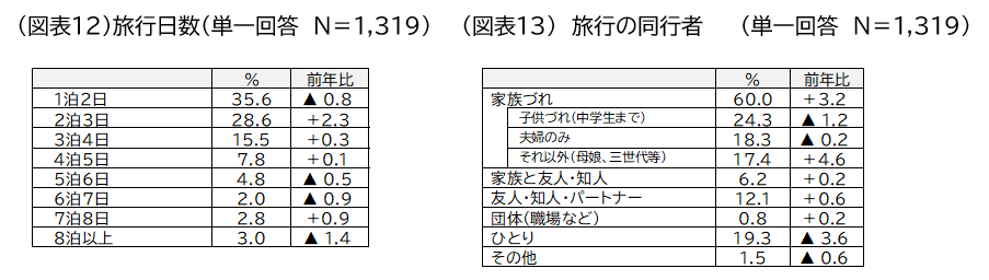 旅行日数:「1泊2日」が35.6%と最も多かったものの、前年より0.8ポイント減少しました。「2泊3日(28.6%、前年比+2.3ポイント)」「3泊4日(15.5%、同+0.3ポイント)」「4泊5日(7.8%、同+0.1ポイント)」は増加し、5泊以上は7泊を除き昨年より割合が減少しました(図表12)。