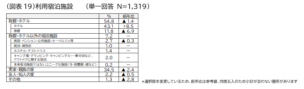 利用宿泊施設:「ホテル」が43.1%と最も多く、次いで「実家・親族の家(34.5%、前年比▲2.4ポイント)」となりました。2021年度調査では「ホテル」は1.3ポイント減少し34.6%でしたが、今回の調査では8.5ポイント増加しました。一方、「旅館」は6.9ポイント減少しました。コロナ禍では、感染症防止の観点から、自然や温泉地に近い旅館の滞在意向が高い傾向でしたが、ホテルが回復しつつあり、都市部への意向が高まっている様子がうかがえます(図表19)。