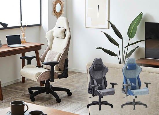 ソファーファブリックによる優しい手触りと座り心地で、ワンランク上のおうち時間をお過ごしください。ホッとした座り心地を体感できるゲーミングチェアです。ベージュ、グレー、ブルーの3色展開。