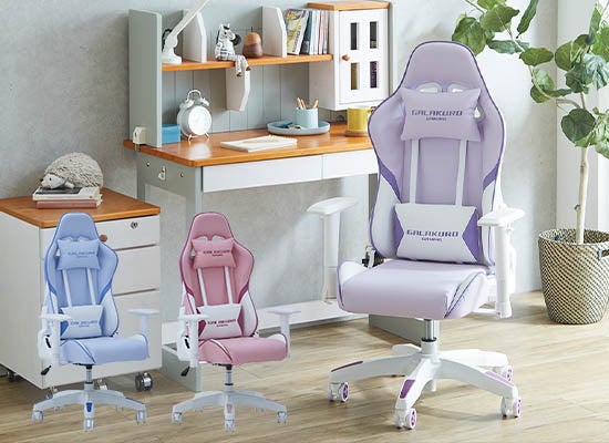 ティーンや女性ユーザー、小柄な体格の方向けに低座面にサイズ設定。明るいインテリアでも違和感なくなじむ、爽やかなパステルカラーのゲーミングチェアです。ラベンダーパープル、アクアブルー、ロゼピンクの3色展開。