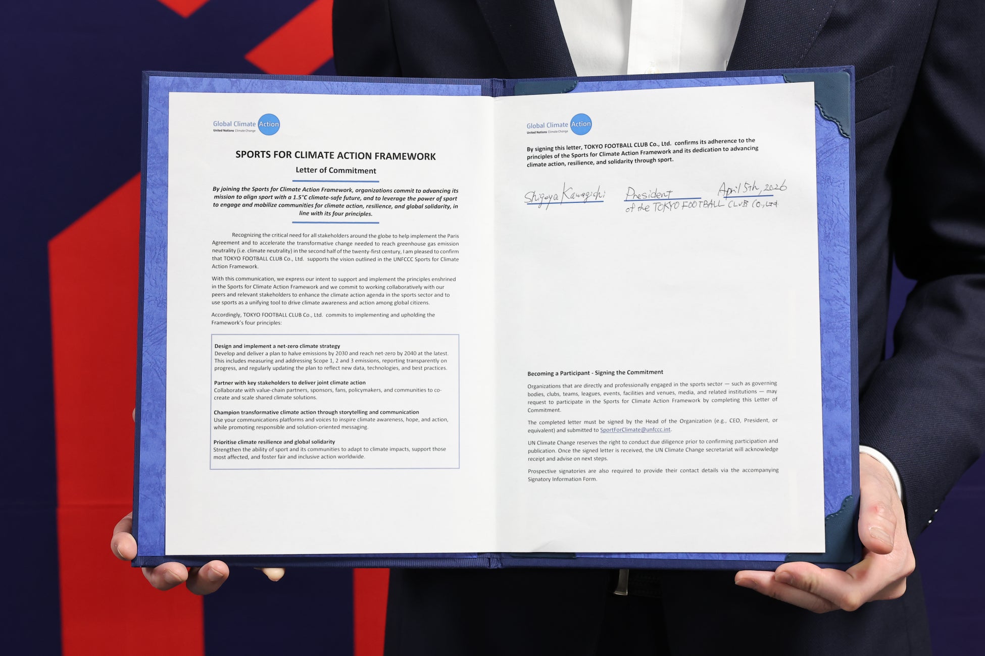 「今回の署名は、私たちのソーシャルステートメントとサステナビリティ戦略を、国際的な気候行動の枠組みへ接続する大きな一歩です。ファン・サポーター、パートナー、自治体、地域のみなさまとともに、東京から具体的なアクションを積み重ね、スポーツの力でよりよい未来をつくってまいります」