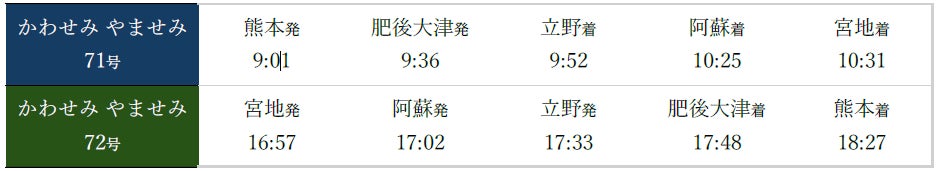 JR九州では、阿蘇へのお出かけにD&S列車「かわせみ やませみ」を「熊本⇔宮地」間において下記の通り運転します。グッズ等の車内販売やビュッフェサービスもございますので、冬のお出かけにぜひご利用ください。